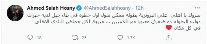 وكتب حسني عبر حسابه على تويتر: "مبروك يا أهلي على البرونزية.. بطولة ممكن نقول أول خطوة في بناء جيل لديه خبرات دولية.. البطولة دي هتفرق معنويا مع اللاعبين.. مبروك لكل جماهير النادي الأهلي في كل مكان".