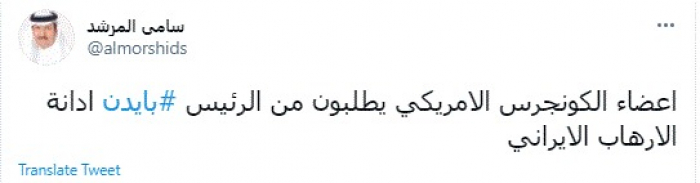 وكتب في تغريدة عبر "تويتر" رصدها "المشهد العربي": "أعضاء الكونجرس الأمريكي يطلبون من الرئيس بايدن إدانة الإرهاب الإيراني".