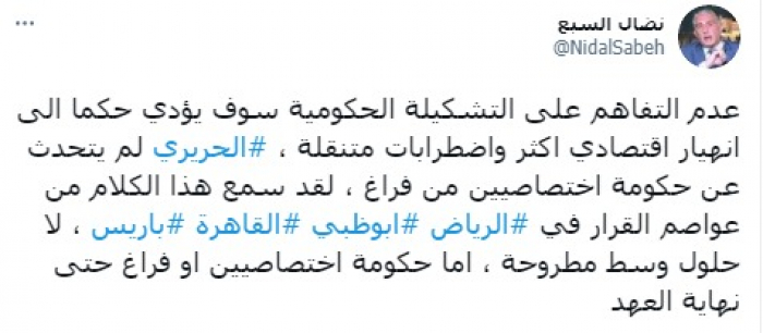 وأوضح أن: "الحريري لم يتحدث عن حكومة اختصاصيين من فراغ، لقد سمع هذا الكلام من عواصم القرار في الرياض وأبوظبي والقاهرة وباريس".