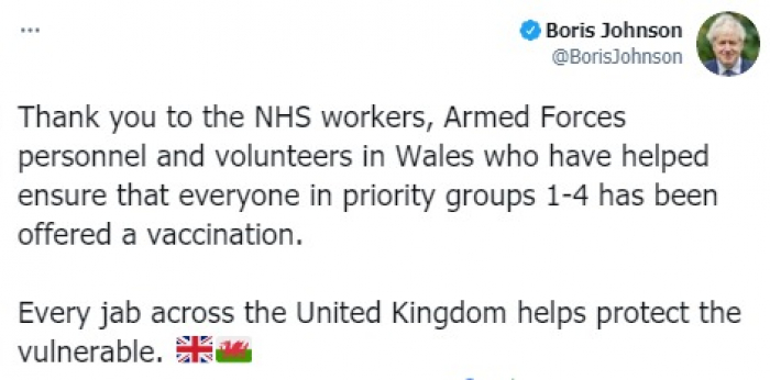 وقال في تغريدة على حسابه بموقع التدوين المصغر تويتر، اليوم مهنئا: "شكرًا لعمال الصحة الوطنية، وأفراد القوات المسلحة والمتطوعين في ويلز الذين ساعدوا في ضمان حصول كل فرد في المجموعات ذات الأولوية 1-4 على التطعيم".