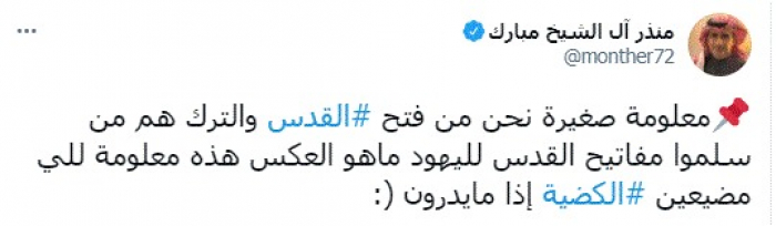 وكتب في تغريدة عبر "تويتر" رصدها "المشهد العربي": "معلومة صغيرة نحن من فتح القدس والترك هم من سلموا مفاتيح القدس لليهود ماهو العكس هذه معلومة للي مضيعين الكضية إذا مايدرون".