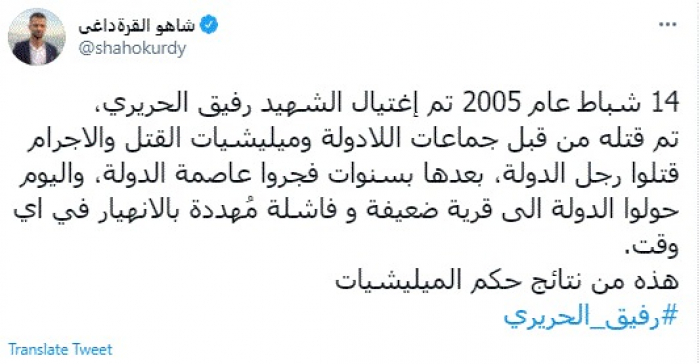 قال الكاتب الصحفي العراقي شاهو القرةداغي، اليوم، إن حادثة اغتيال رفيق الحريري تكشف ضعف جماعات اللادولة، مؤكدًا أن تلك المليشيات – في إشارة لحزب الله- حولت لبنان إلى دولة مهددة بالانهيار.