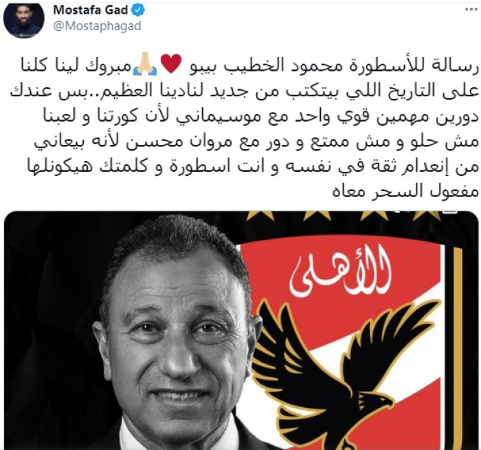 وجه الملحن مصطفى جاد، رسالة إلى رئيس النادي الأهلي المصري، محمود الخطيب، من خلال حسابه بموقع "تويتر".