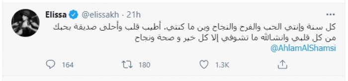 وكتبت إليسا عبر حسابها على تويتر : "كل سنة وإنتي الحب والفرح والنجاح وين ما كنتي.. أطيب قلب وأحلى صديقة.. بحبك من كل قلبي وإن شاء الله ما تشوفي إلا كل خير وصحة ونجاح يا أحلام".
