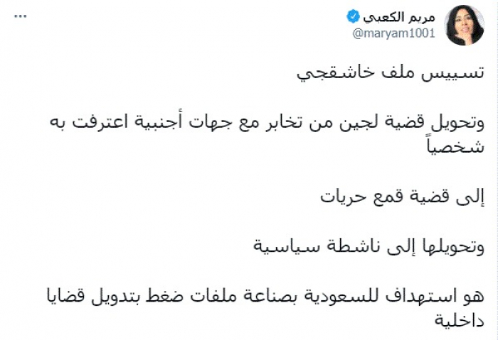 وكتبت في تغريدة عبر "تويتر" رصدها "المشهد العربي": "تسييس ملف خاشقجي وتحويل قضية لجين من تخابر مع جهات أجنبية اعترفت به شخصياً إلى قضية قمع حريات وتحويلها إلى ناشطة سياسية هو استهداف للسعودية بصناعة ملفات ضغط بتدويل قضايا داخلية".