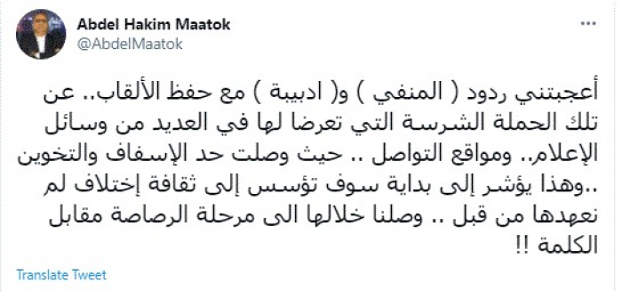 وقال في تغريدة عبر "تويتر" رصدها "المشهد العربي": "أعجبتني ردود (المنفي) و(الدبيبة) مع حفظ الألقاب.. عن تلك الحملة الشرسة التي تعرضا لها في العديد من وسائل الإعلام.. ومواقع التواصل .. حيث وصلت حد الإسفاف والتخوين".