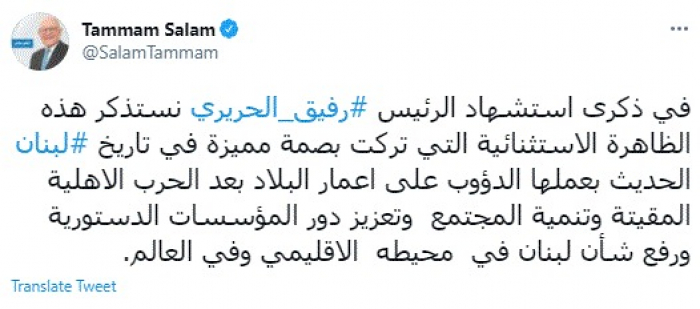 وكتب في تغريدة عبر "تويتر" رصدها "المشهد العربي": "في ذكرى استشهاد الرئيس رفيق الحريري نستذكر هذه الظاهرة الاستثنائية التي تركت بصمة مميزة في تاريخ لبنان الحديث بعملها الدؤوب على إعمار البلاد بعد الحرب الأهلية المقيتة وتنمية المجتمع وتعزيز دور المؤسسات الدستورية ورفع شأن لبنان في محيطه الإقليمي وفي العالم".