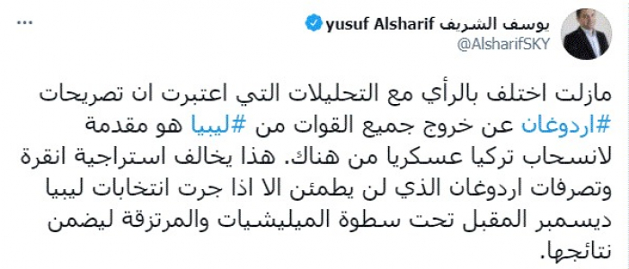 وقال في تغريدة عبر "تويتر" رصدها "المشهد العربي": "ما زلت اختلف بالرأي مع التحليلات التي اعتبرت أن تصريحات أردوغان عن خروج جميع القوات من ليبيا هو مقدمة لانسحاب تركيا عسكريا من هناك".