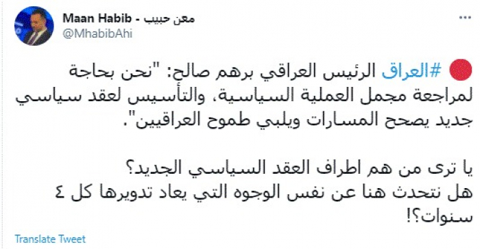 وقال في تغريدة عبر "تويتر" رصدها "المشهد العربي": "العراق الرئيس العراقي برهم صالح: نحن بحاجة لمراجعة مجمل العملية السياسية، والتأسيس لعقد سياسي جديد يصحح المسارات ويلبي طموح العراقيين.. يا ترى من هم اطراف العقد السياسي الجديد؟ هل نتحدث هنا عن نفس الوجوه التي يعاد تدويرها كل ٤ سنوات؟".