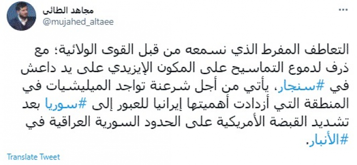 وقال في تغريدة عبر "تويتر" رصدها "المشهد العربي": "التعاطف المفرط الذي نسمعه من قبل القوى الولائية؛ مع ذرف لدموع التماسيح على المكون الإيزيدي على يد داعش في سنجار، يأتي من أجل شرعنة تواجد الميليشيات في المنطقة التي أزدادت أهميتها إيرانيا للعبور إلى سوريا بعد تشديد القبضة الأمريكية على الحدود السورية العراقية في الأنبار".