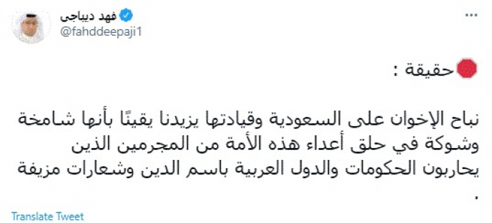وكتب في تغريدة عبر "تويتر" رصدها "المشهد العربي": "نباح الإخوان على السعودية وقيادتها يزيدنا يقينًا بأنها شامخة وشوكة في حلق أعداء هذه الأمة من المجرمين الذين يحاربون الحكومات والدول العربية باسم الدين وشعارات مزيفة".