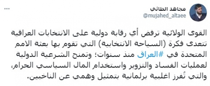 وشدد في تغريدة على حسابه بموقع التدوين المصغر تويتر، اليوم على أن: "القوى الولائية ترفض أي رقابة دولية على الانتخابات العراقية تتعدى فكرة (السياحة الانتخابية) التي تقوم بها بعثة الامم المتحدة في العراق منذ سنوات".