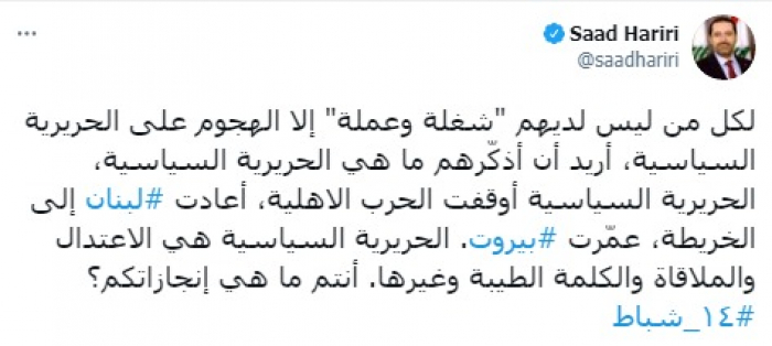وقال في تغريدة على حسابه بموقع التدوين المصغر تويتر، اليوم إنه: لكل من ليس لديهم (شغلة وعملة) إلا الهجوم على الحريرية السياسية، أريد أن أذكّرهم ما هي الحريرية السياسية".