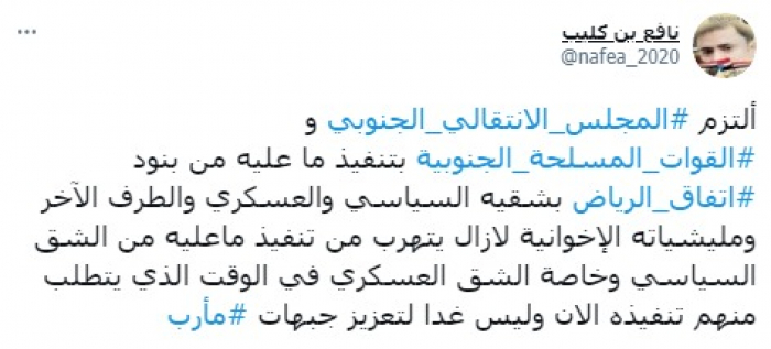 أكد الناشط السياسي نافع بن كليب أن مليشيات الشرعية الإخونية تقابل التزام المجلس الانتقالي الجنوبي باتفاق الرياض بالتهرب من الشقين السياسي والعسكري.