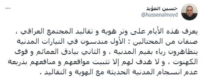 وشدد في تغريدة على حسابه بموقع التدوين المصغر تويتر، اليوم على أن: "يعزف هذه الأيام على وتر هوية وتقاليد المجتمع العراقي ، صنفان من المحتالين: الأول مندسون في التيارات المدنية يتظاهرون رياء بقيم المدنية".