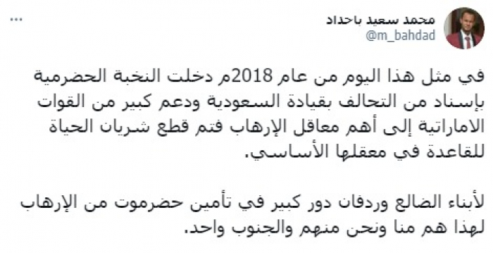 وأوضح في تغريدة على حسابه بموقع التدوين المصغر تويتر، اليوم أنه: "في مثل هذا اليوم من عام 2018م دخلت النخبة الحضرمية بإسناد من التحالف بقيادة السعودية ودعم كبير من القوات الاماراتية إلى أهم معاقل الإرهاب فتم قطع شريان الحياة للقاعدة في معقلها الأساسي".