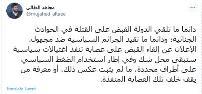 وقال في تغريدة عبر "تويتر" رصدها "المشهد العربي": "دائما ما تلقي الدولة القبض على القتلة في الحوادث الجنائية؛ ودائما ما تقيد الجرائم السياسية ضد مجهول".
