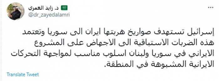 وقال في تغريدة عبر "تويتر" رصدها "المشهد العربي": "إسرائيل تستهدف صواريخ هربتها إيران إلى سوريا وتعتمد هذه الضربات الاستباقية إلى الإجهاض على المشروع الايراني في سوريا ولبنان أسلوب مناسب لمواجهة التحركات الإيرانية المشبوهة في المنطقة".
