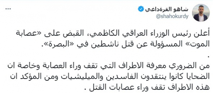 وقال في تغريدة عبر "تويتر" رصدها "المشهد العربي": "أعلن رئيس الوزراء العراقي الكاظمي، القبض على عصابة الموت المسؤولة عن قتل ناشطين في البصرة.. من الضروري معرفة الاطراف التي تقف وراء العصابة وخاصة أن الضحايا كانوا ينتقدون الفاسدين والميليشيات ومن المؤكد أن هذه الأطراف تقف وراء عصابات القتل".