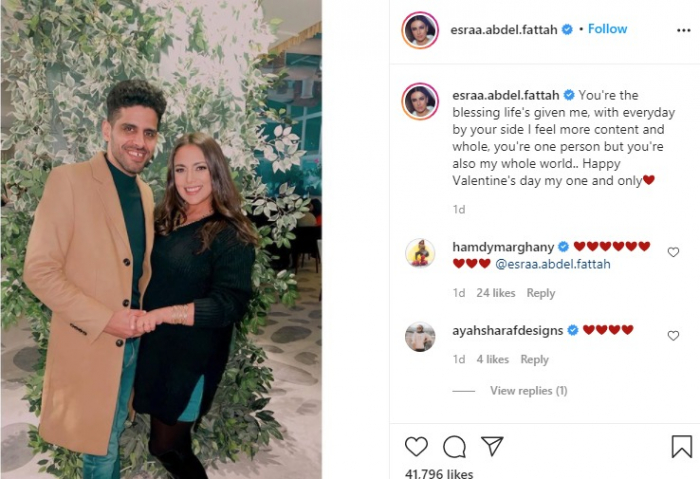 حرصت الفنانة إسراء عبدالفتاح على تهنئة زوجها الفنان حمدي الميرغني بمناسبة احتفالات عيد الحب.