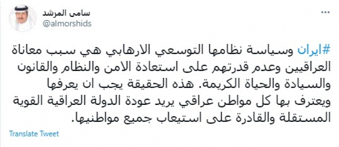 وكتب في تغريدة عبر "تويتر" رصدها "المشهد العربي": "إيران وسياسة نظامها التوسعي الإرهابي هي سبب معاناة العراقيين وعدم قدرتهم على استعادة الأمن والنظام والقانون والسيادة والحياة الكريمة".