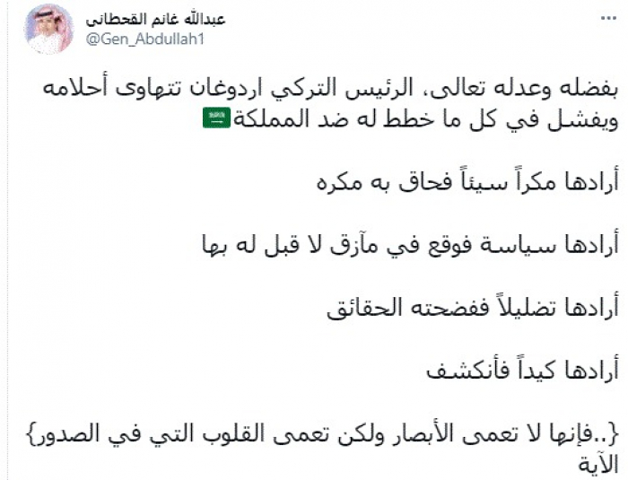 وكتب في تغريدة عبر "تويتر" رصدها "المشهد العربي": "بفضله وعدله تعالى، الرئيس التركي اردوغان تتهاوى أحلامه ويفشل في كل ما خطط له ضد المملكة أرادها مكراً سيئاً فحاق به مكره أرادها سياسة فوقع في مآزق لا قبل له بها أرادها تضليلاً ففضحته الحقائق أرادها كيداً فأنكشف فإنها لا تعمى الأبصار ولكن تعمى القلوب التي في الصدور".
