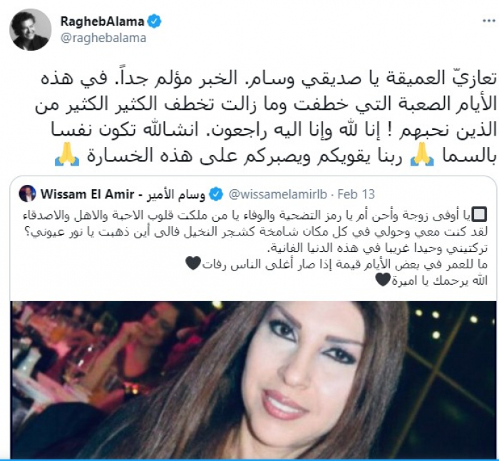 وكتب علامة تغريدة، عبر حسابه الرسمي بموقع "تويتر": "تعازيّ العميقة يا صديقي وسام، الخبر مؤلم جداً، في هذه الأيام الصعبة التي خطفت وما زالت تخطف الكثير الكثير من الذين نحبهم ! إنا لله وإنا إليه راجعون، ان شالله تكون نفسا بالسما ربنا يقويكم ويصبركم على هذه الخسارة".