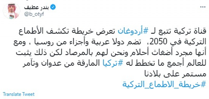 علق الإعلامي السعودي بندر عطيف، اليوم، على واقعة نشر التلفزيون التركي لخريطة نفوذ بلاده لعام 2050، مؤكدًا أن ذلك يثبت للعالم أجمع ما تخطط له تركيا من عدوان وتآمر على المنطقة.