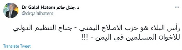 وقال في تغريدة عبر "تويتر" رصدها "المشهد العربي": "رأس البلاء هو حزب الإصلاح اليمني - جناح التنظيم الدولي للإخوان المسلمين في اليمن".