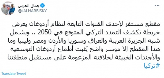 وكتب في تغريدة عبر "تويتر" رصدها "المشهد العربي": "مقطع مستفز لإحدى القنوات التابعة لنظام أردوغان يعرض خريطة تكشف التمدد التركي المتوقع في 2050 .. ويشمل شبه الجزيرة العربية والعراق وسوريا والأردن ومصر وليبيا وما هذا المقطع إلا مؤشر واضح يُثبت أطماع أردوغان التوسعية والأجندات الخبيثة لخلافته المزعومة على مستقبل منطقتنا تركيا".