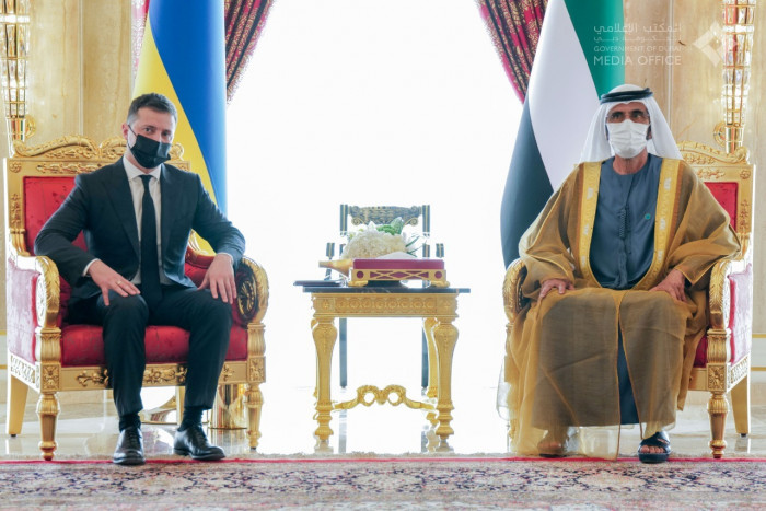 استقبل نائب رئيس دولة الإمارات العربية المتحدة رئيس مجلس الوزراء حاكم دبي، الشيخ محمد بن راشد آل مكتوم اليوم الرئيس الأوكراني فلاديمير زيلينسكي الذي يزور دبي حالياً .