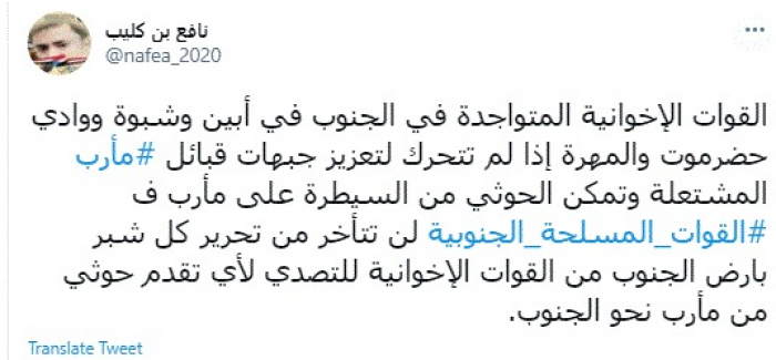 وكتب في تغريدة عبر "تويتر" رصدها "المشهد العربي": "القوات الإخوانية المتواجدة في الجنوب في أبين وشبوة ووادي حضرموت والمهرة إذا لم تتحرك لتعزيز جبهات قبائل مأرب المشتعلة وتمكن الحوثي من السيطرة على مأرب فالقوات المسلحة الجنوبية لن تتأخر من تحرير كل شبر بأرض الجنوب من القوات الإخوانية للتصدي لأي تقدم حوثي من مأرب نحو الجنوب".
