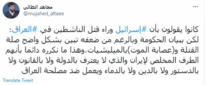 وقال في تغريدة عبر "تويتر" رصدها "المشهد العربي": "كانوا يقولون بأن إسرائيل وراء قتل الناشطين في العراق؛لكن ببيان الحكومة وبالرغم من ضعفه تبين بشكل واضح صلة القتلة و(عصابة الموت) بالمليشيات، وهذا ما نكرره دائما بأنهم الطرف المخلص لإيران والذي لا يعترف بالدولة ولا بالقانون ولا بالدستور ولا بالدين ولا بالدماء ويعمل ضد مصلحة العراق".