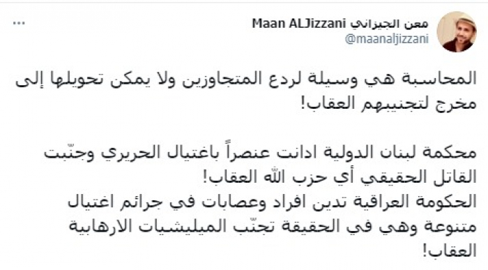 ونبه في تغريدة على حسابه بموقع التدوين المصغر تويتر، اليوم إلى أن: "المحاسبة هي وسيلة لردع المتجاوزين ولا يمكن تحويلها إلى مخرج لتجنيبهم العقاب!".