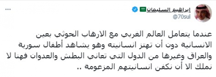 وأوضح في تغريدة على حسابه بموقع التدوين المصغر تويتر، اليوم أنه: "عندما يتعامل العالم الغربي مع الارهاب الحوثي بعين الإنسانية دون أن تهتز إنسانيته وهو يشاهد أطفال سورية والعراق وغيرهما من الدول التي تعاني البطش والعدوان فهنا لا نملك إلا أن نكفن إنسانيتهم المزعومة".