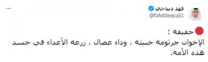وشدد في تغريدة على حسابه بموقع التدوين المصغر تويتر، اليوم على أنه: "حقيقة: الإخوان جرثومة خبيثة، وداء عضال، زرعه الأعداء في جسد هذه الأمة".