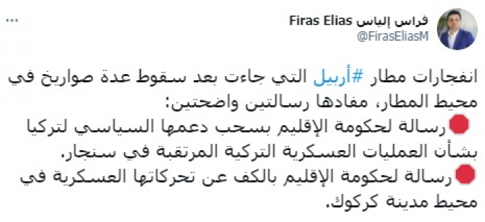 وأشار في تغريدة على حسابه بموقع التدوين المصغر تويتر، اليوم الاثنين، إلى أن: "انفجارات مطار أربيل التي جاءت بعد سقوط عدة صواريخ في محيط المطار، مفادها رسالتان واضحتان".
