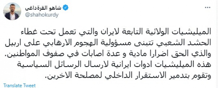 وقال في تغريدة عبر "تويتر" رصدها "المشهد العربي": "الميليشيات الولائية التابعة لإيران والتي تعمل تحت غطاء الحشد الشعبي تتبنى مسؤولية الهجوم الإرهابي على أربيل والذي ألحق أضرارا مادية وعدة اصابات في صفوف المواطنين".