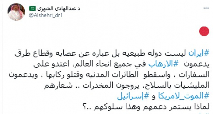الشهري: إيران عصابة.. وتدعم الإرهاب بجميع أنحاء العالم