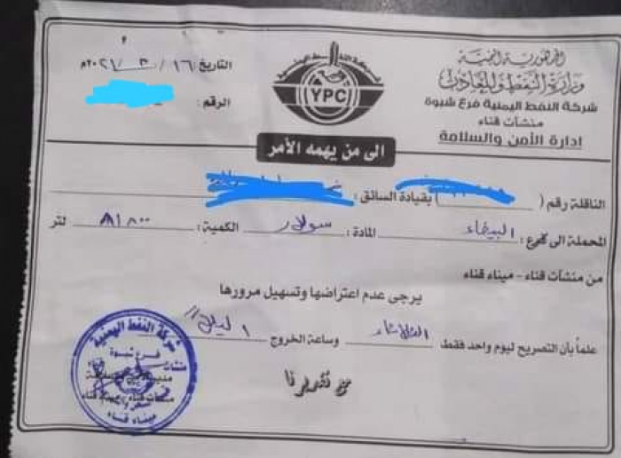 وهربت السلطة الإخوانية في المحافظة النفطية 81 ألف لتر سولار، إلى محافظة البيضاء عبر ميناء قنا في شبوة.