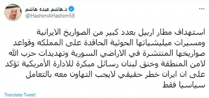 وكتب في تغريدة عبر "تويتر" رصدها "المشهد العربي": "استهداف مطار أربيل بعدد كبير من الصواريخ الإيرانية ومسيرات مليشياتها الحوثية الحاقدة على المملكة وقواعد صواريخها المنتشرة في الأراضي السورية وتهديدات حزب الله لأمن المنطقة وخنق لبنان رسائل مبكرة للإدارة الأمريكية تؤكد على ان إيران خطر حقيقي لايجب التهاون معه بالتعامل سياسيًا فقط".