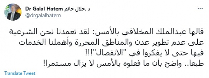 وكتب في تغريدة عبر "تويتر" رصدها "المشهد العربي": "قالها عبدالملك المخلافي بالأمس: لقد تعمدنا نحن الشرعية على عدم تطوير عدن والمناطق المحررة وأهملنا الخدمات فيها حتى لا يفكروا في الانفصال".