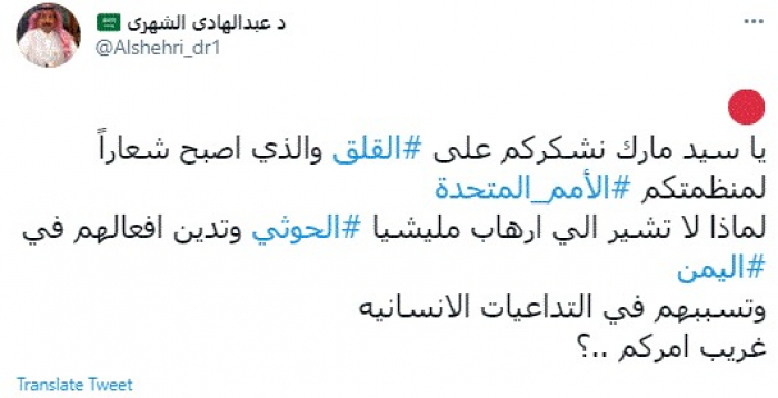 الشهري لـ مسؤول أممي: لماذا لا تشير لإرهاب الحوثيين وتدين أفعالهم باليمن؟