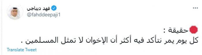 وقال في تغريدة عبر "تويتر" رصدها "المشهد العربي": "كل يوم يمر نتأكد فيه أكثر أن الإخوان لا تمثل المسلمين".