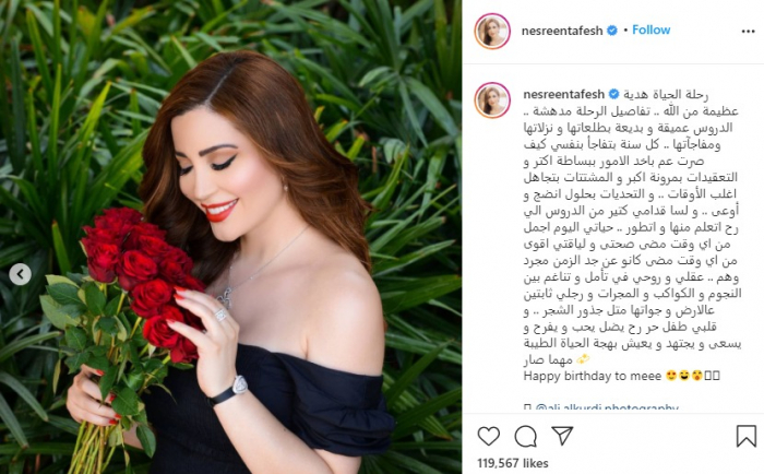 وخضعت نسرين لجلسة تصوير جديدة كشفت عنها، عبر حسابها الرسمي بموقع "إنستجرام"، علقت :" رحلة الحياة هدية عظيمة من الله، تفاصيل الرحلة مدهشة، الدروس عميقة و بديعة بطلعاتها ونزلاتها ومفاجآته، كل سنة بتفاجأ بنفسي كيف صرت عم باخد الأمور ببساطة أكتر والتعقيدات بمرونة أكبر والمشتتات بتجاهل أغلب الأوقات، والتحديات بحلول انضج وأوعى".