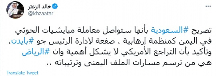 الزعتر: مواصلة السعودية لمعاملة الحوثي كمنظمة إرهابية صفعة لإدارة بايدن
