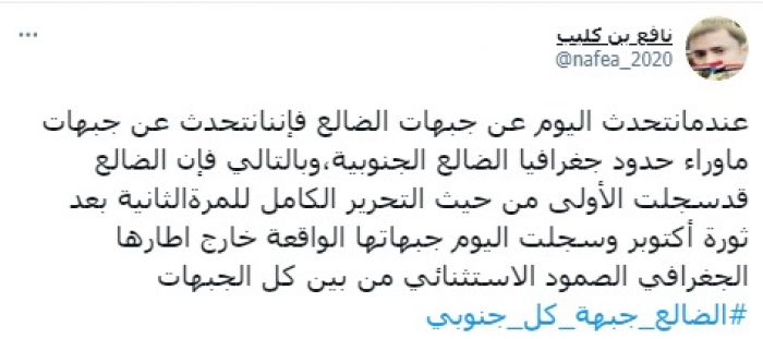 وقال في تغريدة على حسابه بموقع التدوين المصغر تويتر، إنه: "عندما نتحدث اليوم عن جبهات الضالع فإننا نتحدث عن جبهات ما وراء حدود جغرافيا الضالع الجنوبية".