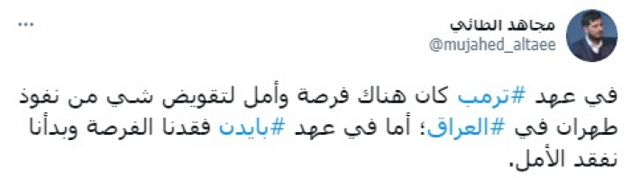 وشدد في تغريدة على حسابه بموقع التدوين المصغر تويتر، اليوم على أنه: "في عهد ترامب كان هناك فرصة وأمل لتقويض شيء من نفوذ طهران في العراق".