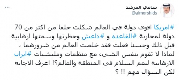 وأشار في تغريدة على حسابه بموقع التدوين المصغر تويتر، اليوم إلى أن: "أمريكا أقوى دولة في العالم شكلت حلفا من أكثر من 70 دولة لمحاربة القاعدة وداعش وحظرتها وسمتها إرهابية قبل ذلك، وحسنا فعلت، فقد خلصت العالم من شرورهما".