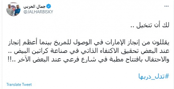 وقال في تغريدة عبر "تويتر" رصدها "المشهد العربي": "لك أن تتخيل.. يقللون من إنجاز الإمارات في الوصول للمريخ بينما أعظم إنجاز عند البعض تحقيق الاكتفاء الذاتي في صناعة كراتين البيض .. والاحتفال بافتتاح مطبة في شارع فرعي عند البعض الآخر".